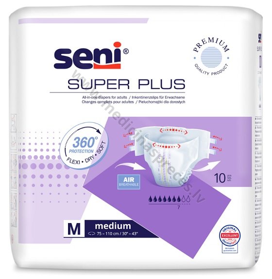 Super Seni Plus autiņbiksītes. Klasiskās elpojošas viscaur gaisa caurlaidīgās autiņbikses Super Seni Plus ir lieliska un uzticama aizsardzība nesaturēšanas gadījumā.