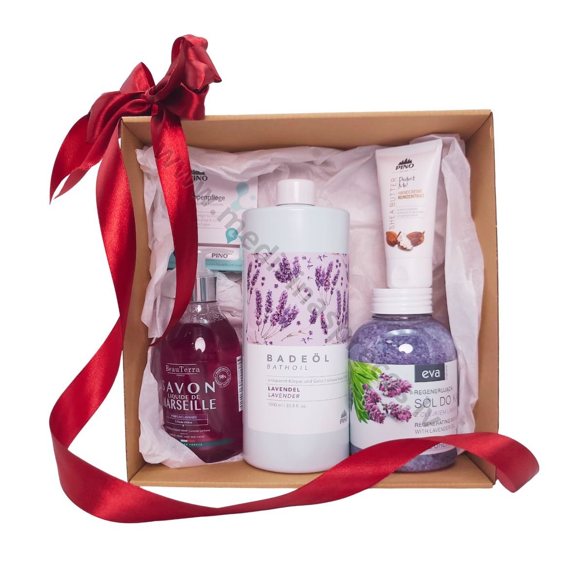 Skaistuma grozs Sievietes mieram – Relaksējošs lavandas SPA dāvanu komplekts ar vannas eļļu, sāli, roku krēmu, lūpu balzāmu un šķidrajām ziepēm.