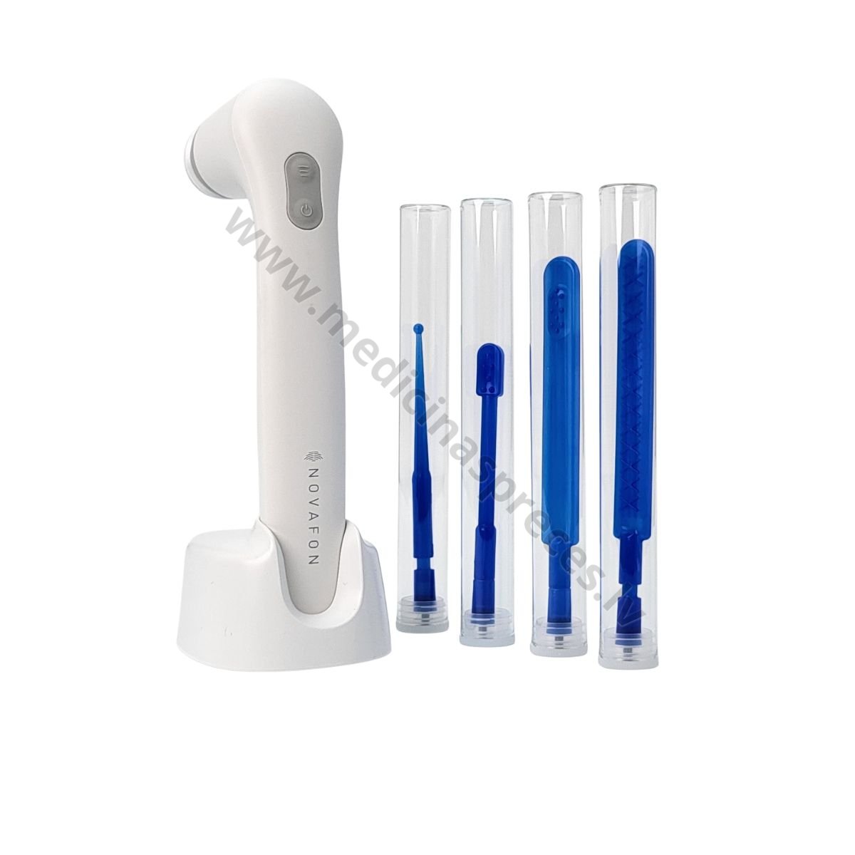 NOVAFON WHITE iekārta, 8 intraorālie uzgaļi un uzlādes stacija akustisko viļņu vibroterapijai.
